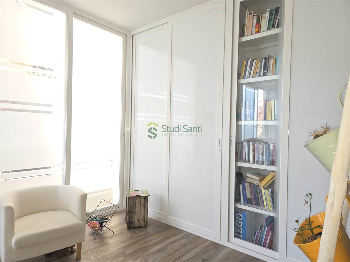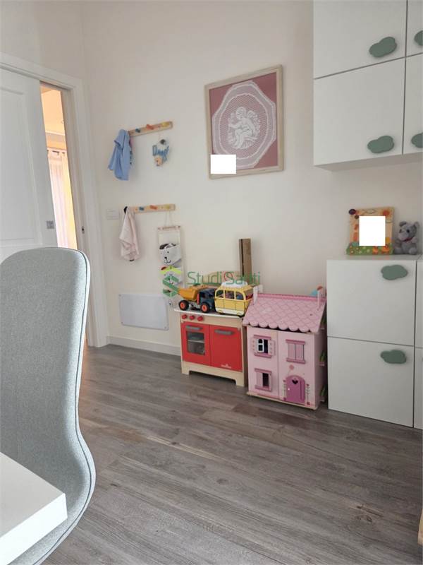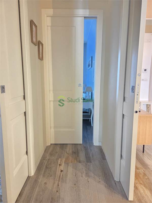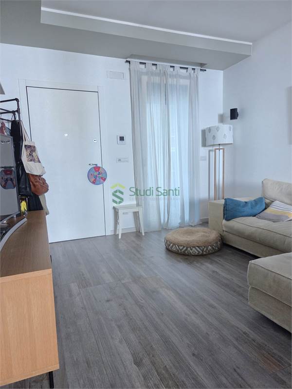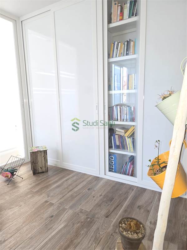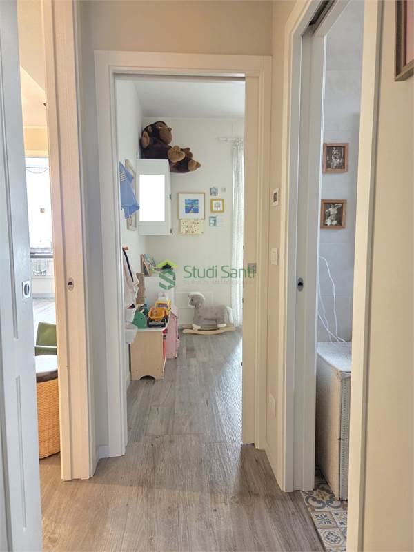 Rifiniture: porta d'ingresso blindata, riscaldamento e raffrescamento al pavimento, impianto canalizzato per deumidificatore, pavimentazione in gress porcellanato effetto parquet, videocitofono, infissi in pvc doppio vetro con apertura vasi stasi, zanzariere, tapparelle elettriche, tende da sole, impianto d'allarme, due porte a scrigno per accedere nella zona tinello, fracasè, fibra e pannelli solari condominiali.